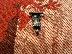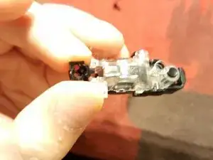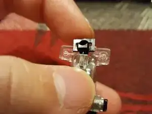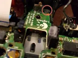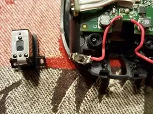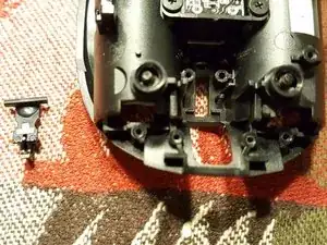 После откручивания платы переключателя питания из корпуса может выпасть маленькая пластиковая деталь. Эта деталь служит для нажатия на выключатель питания при закрывании крышки линз мыши.