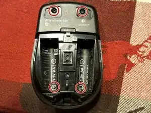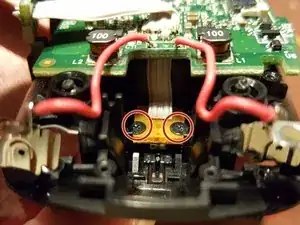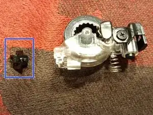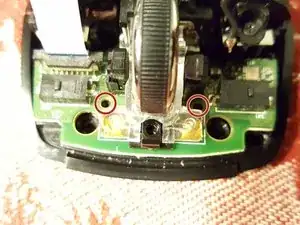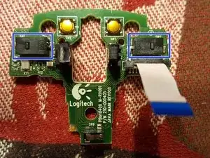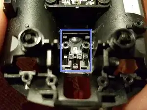 Если пластиковая деталь выпала, вот как она должна быть расположена при сборке мыши. Пластиковая деталь отмечена синим.