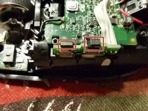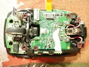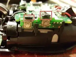 Удалите плату кнопок «назад/вперёд» из её держателя в корпусе мыши, аккуратно оттянув назад два зажима и выдвинув плату наружу.