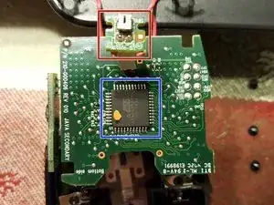 Здесь показан вид снизу основной печатной платы. Плата цепи выключателя питания выделена красным, а микропроцессор мыши — синим.