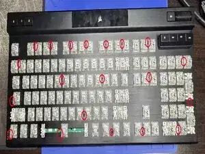 Этот гид показывает разбор клавиатуры, чтобы вы могли добраться до колеса громкости и почистить энкодер с помощью контактного очистителя