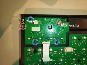 удалите 3 чёрных винта (синие круги) и 2 серебряных винта (красные круги)