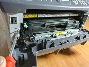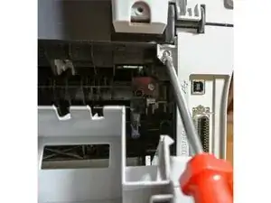 Удалите винт на правой стороне, как показано на изображении. Если вы хотите снять автоподатчик документов, этот винт также можно удалить сейчас.
