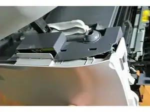 Откройте область стекла сканера и будьте осторожны, чтобы ADF не упал с левой стороны. Это может сломать петлю на противоположной стороне.