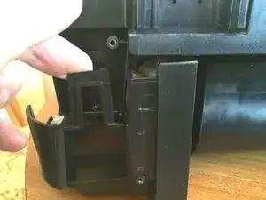 Поставьте принтер на левый бок, отстегните правую боковую панель сначала по верхнему краю, а затем сзади. Теперь панель должна полностью сняться.
