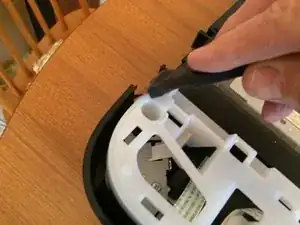 Панель всё ещё удерживается скрытой защёлкой под прямоугольным отверстием рядом с краем панели управления. Освободите её, надавив вниз лезвием плоской отвёртки. Левая панель теперь должна сняться.