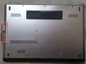 Отверните два винта PH00 с задней панели ноутбука, расположенные в крайнем левом и правом краях задней панели.