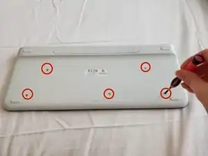 Используйте маленькую крестовую отвертку, чтобы выкрутить все видимые винты на задней панели клавиатуры.