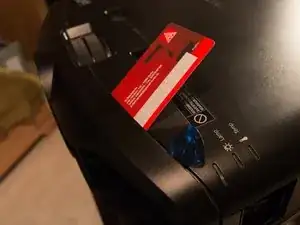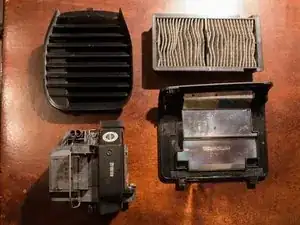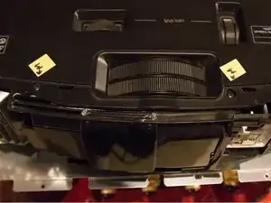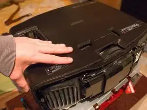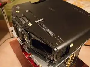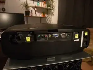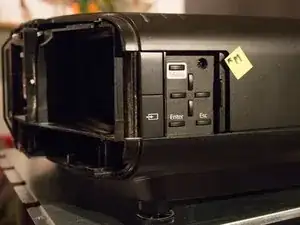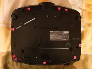 Теперь вы можете снять переднюю панель. Я использовал медиатор и пластиковую карту. Осторожно вставьте медиатор с левой стороны проектора между корпусом и передней панелью и попытайтесь продвинуться к середине. Сделайте то же самое с правой стороны, передняя панель должна сняться.