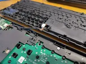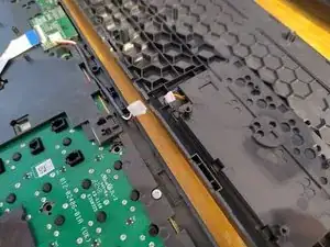 От батареи идёт кабель, соединяющий заднюю пластиковую крышку с передней частью клавиатуры. Разъём защёлкнут в пластиковой рамке над платой и может быть извлечён с помощью пинцета или лопатки.