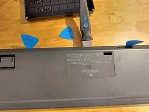 Между задней крышкой и корпусом имеется небольшой зазор. Вставьте тонкий пластиковый инструмент для вскрытия в верхней части клавиатуры.