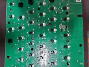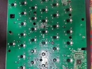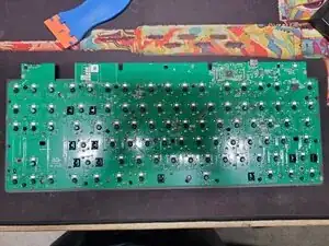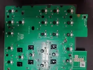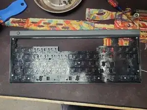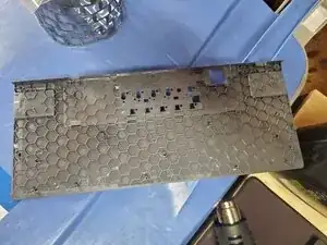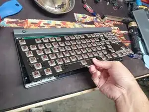Снимите наклейку/подложку с передней части клавиатуры. Я начал с угла. Понадобится фен/тепловой пистолет, чтобы размягчить клей. Не направляйте тепло на одном месте слишком долго, так как материал плавится довольно быстро.