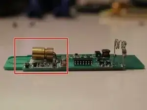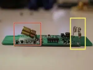 Причиной, по которой я разобрал своё устройство, стало то, что лазерный диод (красный) больше не проецировал из корпуса. Вы можете ясно видеть, что лазер находится под очень странным углом. Я не представляю, как это произошло.