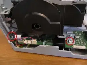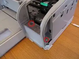 Удалите 2 винта, видимые с передней части принтера справа от лотка для бумаги, которые крепят печатающий механизм к основанию. Один находится на дне глубокого отверстия.