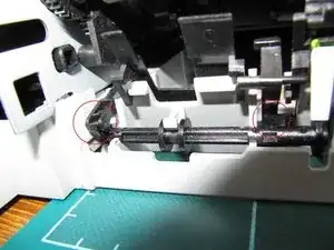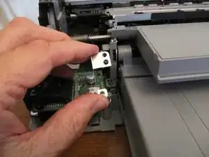 Теперь печатающий механизм можно вынуть. Потребуется некоторая покачка, чтобы освободить металлическую рамку механизма из пластикового основания в точке, близкой к зажиму, удерживающему упомянутый рычаг.