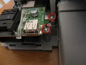 Удалите ещё 2 винта левее лотка для бумаги, по обе стороны от модуля кард-ридера. Справа от модуля кард-ридера на самом деле есть 2 винта, и пока следует удалить только тот, который находится сзади.