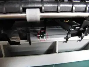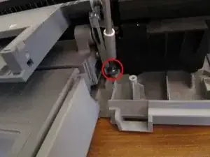 Удалите ещё 2 винта слева от лотка для бумаги. Один из них фиксирует небольшой металлический элемент, который следует аккуратно отложить в сторону, чтобы не забыть при сборке.