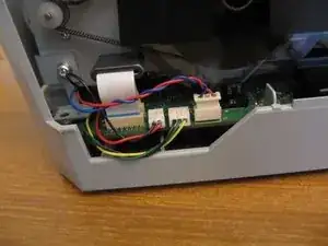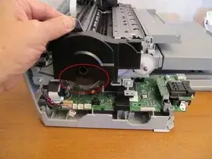 Поднимите левый конец печатающего механизма. Это создаст достаточно места, чтобы выдвинуть основную плату логики в передней части принтера.