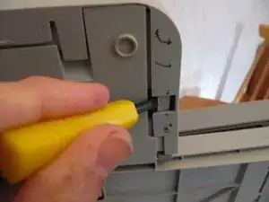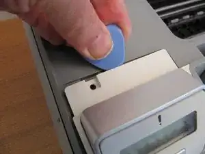 Боковая панель всё ещё удерживается защёлкой под местом, где была панель управления. Нажмите на неё снизу плоской отвёрткой. Поднимите эту часть боковой панели вперёд, следя за тем, чтобы изгиб происходил у переднего угла, а не у защёлки, где материал относительно слаб.