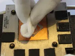 Нанесите 70–90% спирт, подождите, пока термопаста увлажнится, затем очистите кусочком ватного диска, повторяйте до получения хорошего результата, как на третьем фото.