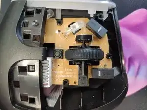 Без винтов пластиковая крышка, закрывающая колёсико прокрутки и его энкодер, свободно снимается. Примечание — колёсико прокрутки просто вставлено в шестиугольный паз энкодера и ничем дополнительно не зафиксировано.