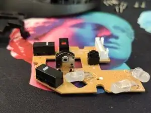 Ещё одна плата крепится к нижней половине корпуса винтами. Чтобы снять её, аккуратно отсоедините разъём питания и выкрутите два винта. Обратите внимание, что непрозрачный слой закрывает оптическую часть. Если этот слой повредится при разборке, его можно заменить изолентой.