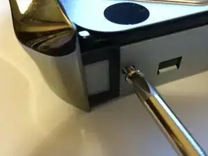 Осторожно приподнимите резиновые ножки на всех четырёх углах. Ножки не обязательно полностью снимать, нужно только получить доступ к (4) винтам на каждом конце.