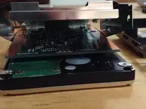 Если отогнуть стальной кожух, вы увидите плату управления, прикрепленную к жесткому диску двумя маленькими крестообразными винтами.