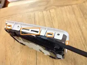 Всего имеется 12 пластиковых защелок, удерживающих каркас, в котором зафиксирован диск: по 4 на длинных сторонах и по 2 на коротких. С помощью лопатки подденьте пластик со стороны разъемов.