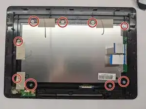 Открутите 9 широких винтов Phillips #00, удерживающих LCD-панель на передней пластиковой раме