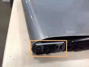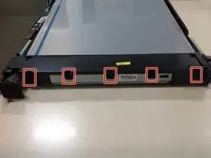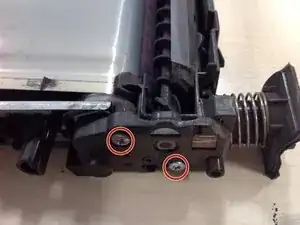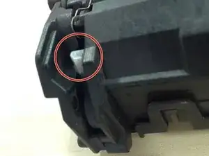 Осторожно отогните пять пластиковых защёлок, удерживающих крышку сборника тонера, прикреплённого к концу промежуточного передающего барабана.