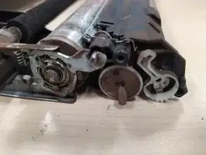 Снимите металлическую раму, соединяющую ролик барабана со сборником тонера.