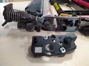 В одном случае на пластиковом скребке в блоке сбора тонера был чётко выраженный изгиб. Новые скребки доступны на Aliexpress. Установка заключается в освобождении двух пружин крепления и вставке нового скребка под пластиковым червячным шнеком.
