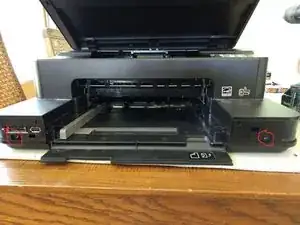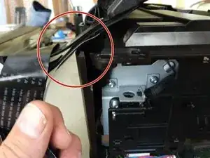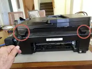 Это делается поддеванием кромки крышки, которая находится рядом с лотком для бумаги, и выталкиванием кромки наружу.
