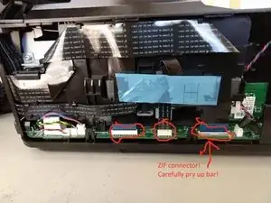 ВАЖНО: один разъем — ZIF (с нулевым усилием вставки). Поднимите фиксирующую планку и затем извлеките кабель. При сборке убедитесь, что планка поднята, вставьте кабель и опустите планку.
