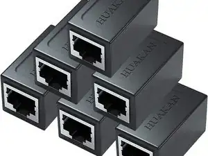 Я купил «RJ45 Coupler» (бренд: Huakan) на Amazon. На момент ремонта 6 соединителей стоили $6.99 ... теперь $9.99 (США). Эти соединители имеют тонкую нержавеющую стальную рамку с каждой стороны, в которую «щёлкает» LAN‑кабель.