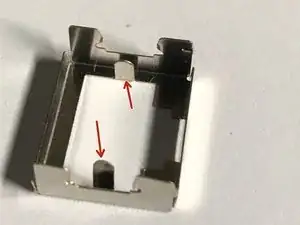 После отделения нержавеющих лицевых рамок от соединителя RJ45 обратите внимание на показанные красной стрелкой «зубцы», которые можно подогнуть для обеспечения наилучшей посадки поверх сломанного разъёма RJ45. При необходимости отрегулируйте для плотной и глубокой посадки.