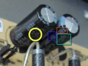 Используйте отвёртку или металлическую полоску, чтобы замкнуть выводы старых конденсаторов, пока они ещё на плате. Это разрядит остаточное напряжение, чтобы они не искрили и не ударили вас при ремонте.