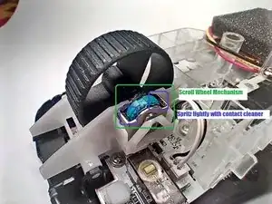 Механизм виден и доступен без разборки. Убедитесь, что мышь выключена и отключена. Можно вставить трубочку распылителя через пространство вокруг колеса в отмеченное синей областью место. Используйте очень лёгкое распыление.