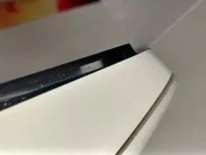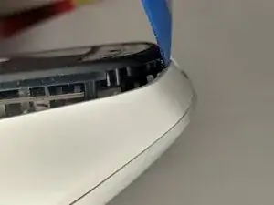 Когда большая часть крышки отделится, передняя часть потребует немного иного подхода, чтобы не повредить фиксирующие защёлки. Вставьте пластиковую карту в угол и аккуратно проведите ею к передней части мыши вблизи кнопок.