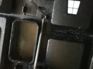 При снятии больших клавиш (показано на изображении 1) металлическая рамка соединяет клавишу с передней панелью. (Изображение 2) Используйте лопатку, чтобы отделить рамку от клавиши.