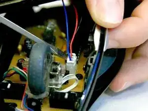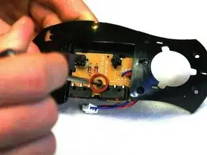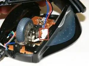 Прикоснитесь инструментом для разрядки к выводам конденсаторов на плате, чтобы высвободить накопленную энергию. Если выводы недоступны, подождите, пока не снимете плату с корпуса мыши.