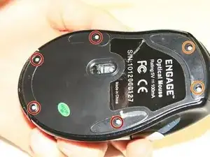 Используйте отвертку Phillips #1, чтобы удалить четыре винта длиной 5 мм из нижней части мыши.