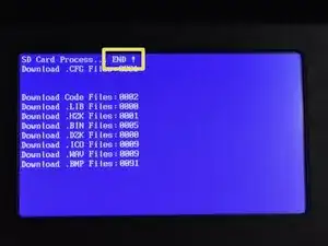 Если всё прошло правильно, вы увидите загрузку файлов, мигание изображений, затем «END» вверху. Смотрите следующий шаг для просмотра видео.