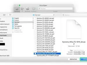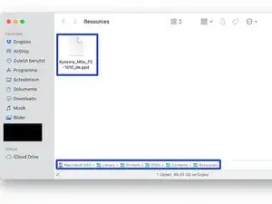 Перейдите в папку Загрузки и в ранее скачанную папку (PPD's_KSL_8.4). Откройте подпапку «English» и скопируйте файл «Kyocera_Mita_FS-1010_en.ppd» в /Library/Printers/PPDs/Contents/Resources.