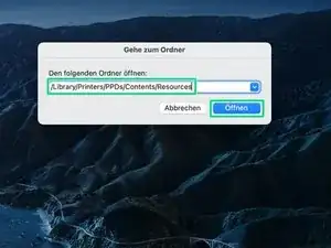 В появившемся окне введите путь /Library/Printers/PPDs/Contents/Resources и нажмите «Открыть».
