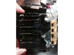 Какое счастье — наконец-то обнаружить причину! Насладитесь этим моментом… На втором фото показана плата датчика, которую нужно почистить; при этом важно сохранить целостность плоского шлейфа. Слева видна ещё загрязнённая (и подлежащая очистке) пружинная часть с ползунками, которые при установке картриджа входят в оптические датчики.