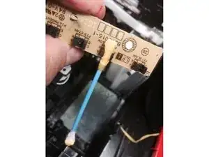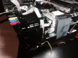 Откройте крышку сканера. Снимите две тонкие горизонтальные пластиковые накладки рядом с разъёмом USB, под ними находятся шлейф справа и круглый кабель слева. Аккуратно отключите разъём. Все разъёмы имеют цветовую маркировку — их нельзя перепутать. Слева примерно пять разъёмов, один удлинительный кабель нужно открепить Phillips-винтом.