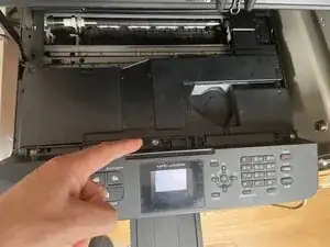 Слева отожмите рычаг, выполняющий функцию упора крышки, чтобы слегка провернуть его (он прочный) в верхней части. При открывании всей крышки под определённым углом вы сможете вытащить петлю вправо без усилия. После того как кабели будут освобождены, можно снять всю крышку сканера. Пока это был самый сложный этап. Отложите её в сторону.