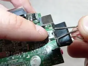 Используйте складную канцелярскую скрепку, чтобы прижать USB-разъём к логической плате.